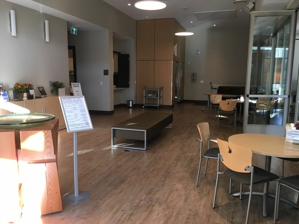Lynn Valley United Church's narthex is the main foyer space within the building. It serves as a welcoming entrance into the church and is perfect for small gatherings. Chairs and cocktail-height tables can also be added to the space for no extra charge.